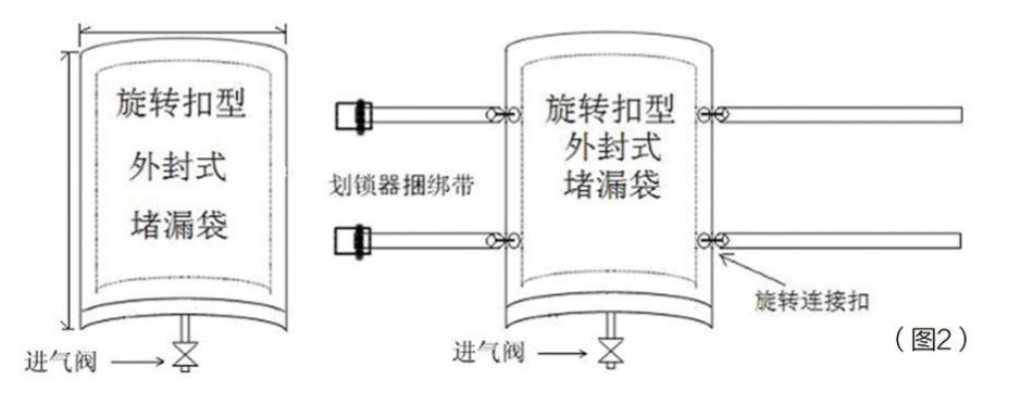 • 2、旋轉(zhuǎn)扣型:應(yīng)用在金屬、塑料、玻璃鋼材質(zhì)的各類管道、罐車、容器罐人為損壞或腐蝕穿孔跑、冒、滴、漏導(dǎo)致的圓孔、橢圓孔類泄漏充氣應(yīng)急之用,或大型落地式容器罐體底部泄漏,先將堵漏袋拉緊在泄漏部位表面后充氣達(dá)到堵漏的目的。(見圖2)